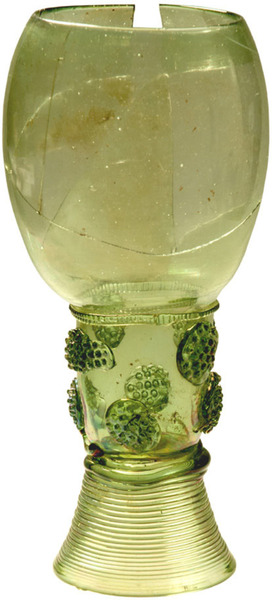 | 4b | roemer met ei- of tonvormige cuppa, geribde draad op de overgang naar de schacht en één of meer verspringende rijen braamnoppen, opgestoken bodem met pontilmerk, gewonden draadvoet |