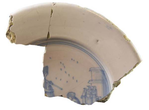 | 5c decoratie | spiegel: binnen dubbele cirkel man met staf bij knielende persoon , rechts hiervan drie personen bij rond gebouw 'de verloren zoon' blauw |