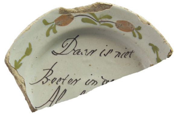 | 5c | onderglazuur groen, bovenglazuur bruin en oranje; vlag: blad met aan weerszijde bloemen; spiegel: tekst: Daar is niet Beeter in de ...Al.... polychroom |