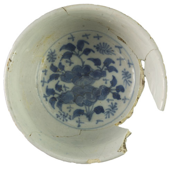 | 5c decoratie | inw: twee trompetbloemen met blad binnen cirkel; uitw: trompetbloem en takjes met bessen in- en uitwendig blauw |