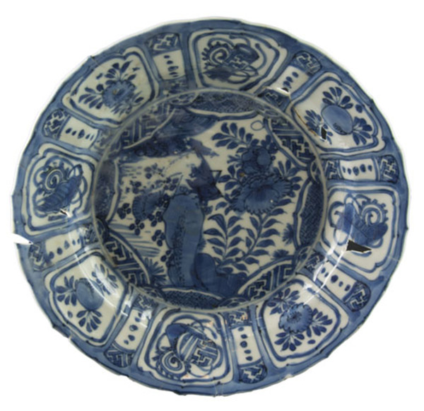| 5c decoratie | spiegel: landschap, rots met vleermuis; vlag: gelukssymbolen afwisselend met perzik en smalle panelen met stippen; onderzijde: 8 panelen met cirkels van stippen en smalle ruyi onderglazuur blauw |