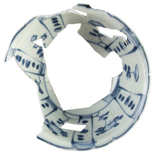 | 5c decoratie | uitw: 6 brede panelen met bloem/vogel motief, smalle panelen met 6 kralen, bodem: vogel op rots onderglazuur blauw |