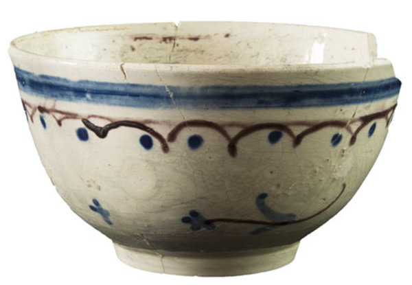 | 5c | onderglazuur blauw, bovenglazuur bruin; uitw: blauw filet onder rand, daaronder bruine boogjes met blauwe stippen, daaronder horizontale bloementakjes polychroom |