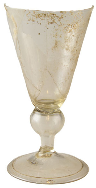 | 4b | conisch kelkglas met afgeronde dikwandige bodem, massieve balusterstam, ook met luchtbel, ook met ribben-relëf, schijfvormige voet met pontilmerk |