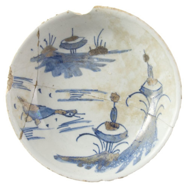 | 5c | landschap met water, eend en stilistische bloemen inw. blauw en goud |