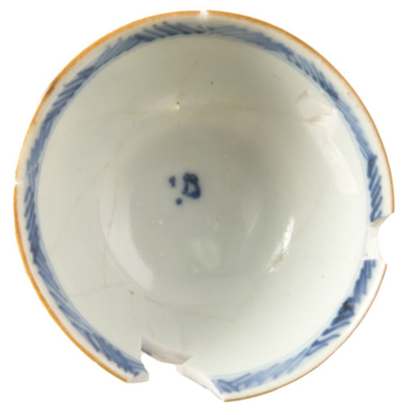 | 5c | inw: onder randstreepjesfantasie, op bodem een bloem; uitw: ene zijde samourai onder boom en andere zijde wolk met tak onderglazuur blauw |