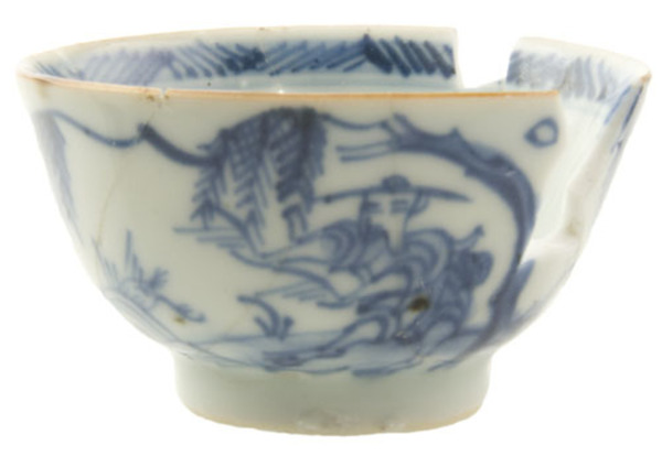 | 5c decoratie | inw: onder randstreepjesfantasie, op bodem een bloem; uitw: ene zijde samourai onder boom en andere zijde wolk met tak onderglazuur blauw |