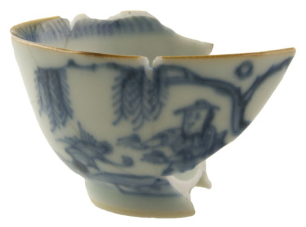 | 5c decoratie | inw: onder randstreepjesfantasie, op bodem een bloem; uitw: ene zijde samourai onder boom en andere zijde wolk met tak onderglazuur blauw |