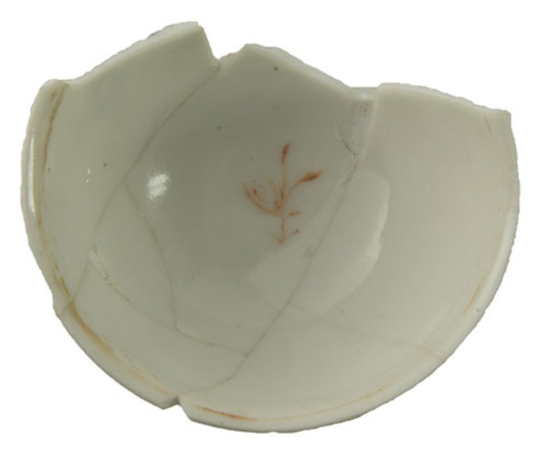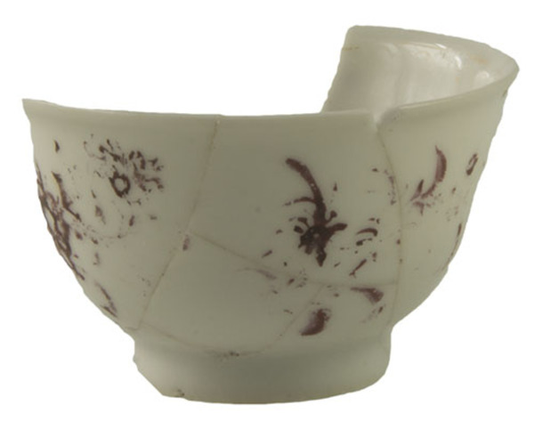 | 5c decoratie | inw: goudfilet onder rand, rode bloementuil op bodem; uitw: paarse bloem/bladeren bovenglazuur paars, goud en rood |