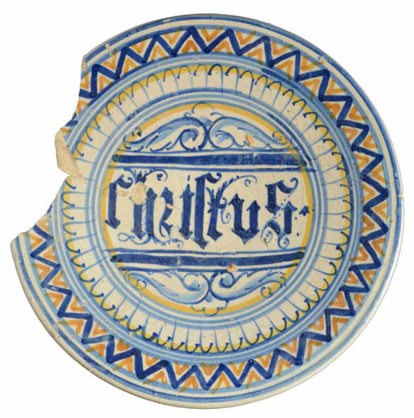 | 5c decoratie | in blauw, geel en oranje: tekst CHRISTUS met doorlopend randmotief als stralenkrans inwendig: polychroom |