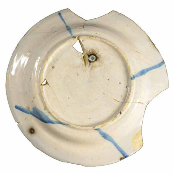 | 5c decoratie | beschildering in blauw: voorzijde: granaatappel en repeterend patroon, achterzijde: vier strepen blauwe beschildering |