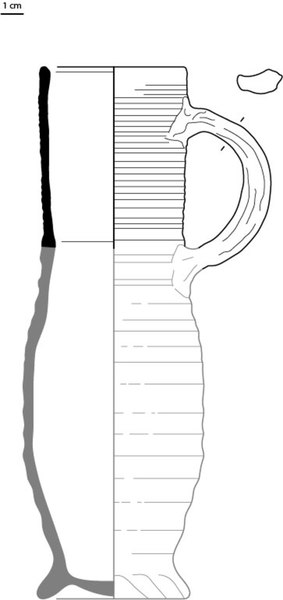 | 4b | lage bekervormige kan met kraag op de halsaanzet, iets verdikte hals, rechte rand, op standring |
