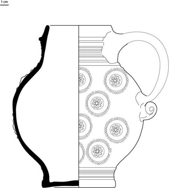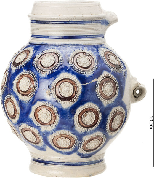 | 5c decoratie | appliques (rozetten), blauwe en paarse beschildering blauw, paars krul bij ooraanzet |