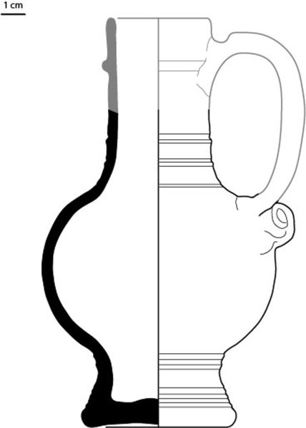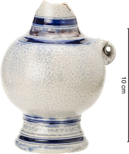 | 4b | kan met taps uitlopende hals, bovenzijde hals met knik naar binnen toelopend, ribbels op schouder en halsaanzet, standvoet |