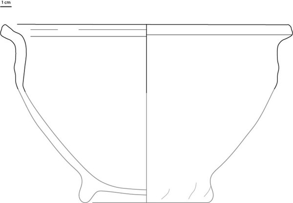 | 4b | wijd uitlopende kom met insnoering hals en uitgebogen, van buiten aangedrukte rand, gewelfde standring |