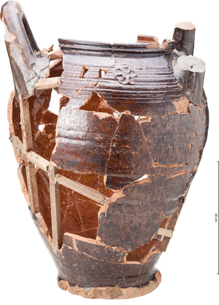 | 5b afwerking (kleur/glazuur) | loodglazuur, uitwendig met mangaanoxide |