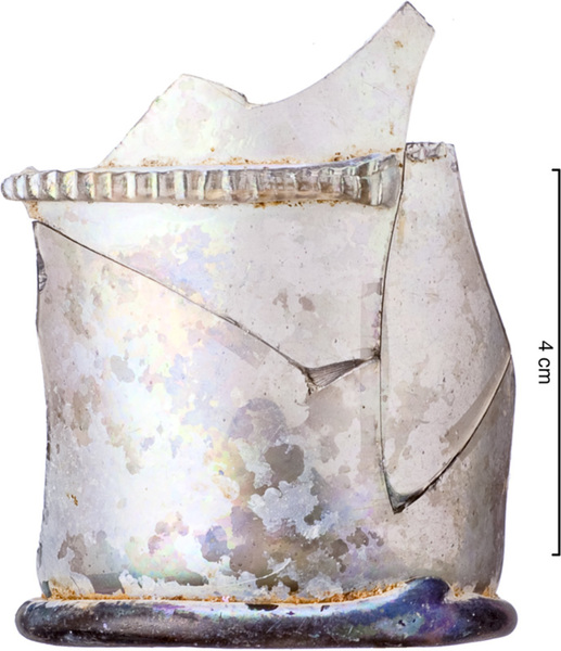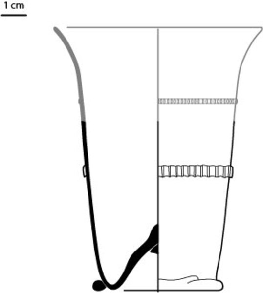 | 4b | cilindrische of lichtconische beker met uitstaande lip, met twee horizontale geribde draden, opgestoken bodem met pontilmerk, voetring |