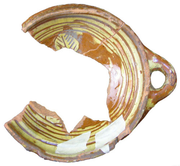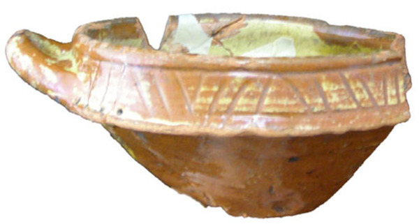 | 5c | sgrafitto in witte slib. Buitenzijde: witte slib met ingekraste diagonale lijnen. Binnenzijde: net binnen de rand ingekraste concentrische cirkels. Centraal een compleet decor met blaadjes in sgrafitto |