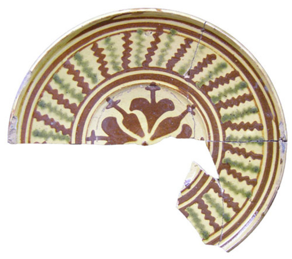 | 5c | slibdecor in roodbruin en kopergroen tegen en achtergrond van witte slib. Net binnen de rand twee filets in bruin, daarbinnen afwisselend bruine en groene zigzagjes, Daarbinnen dubbel bruin filet, daarbinnen bloemmotief in bruin |