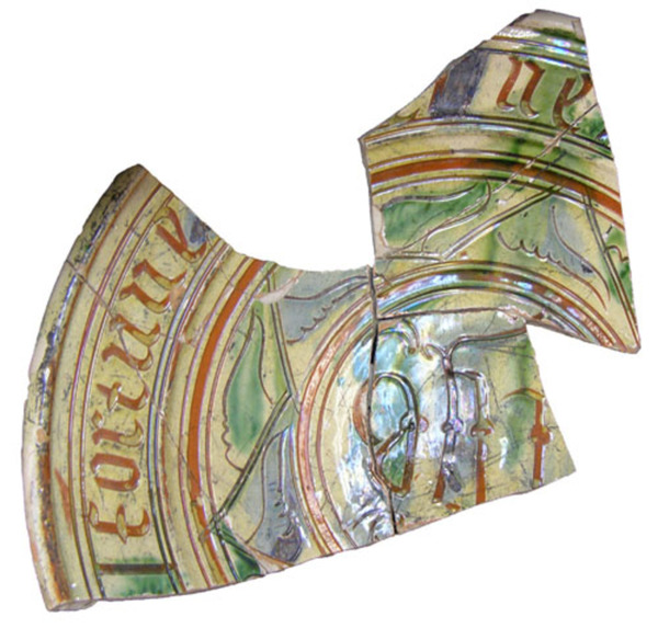 | 5c | dubbele sgrafitto. Centraal op de spiegel IHS ingekrast in gotische letters, met daarover groene vlekken. Spiegel afgelijnd door driedubbele ingekraste filet, waarvan de middelste breed. De middelste zone is door diagonale lijnen in driehoeken verdeeld met daarbinnen ingekraste blaadjes met groen. Dan weer drie filets waarvan de middelste breed. De buitenste zone heeft een ingekraste gotische tekst '...FORTUNE.....NE.....' tussen twee dubbele filets |