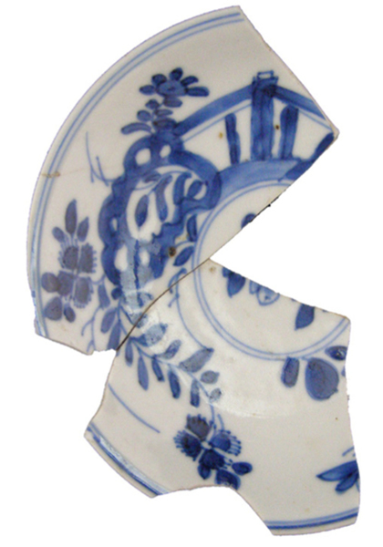 | 5c | inw: dubbel filet net binnen de rand, op de vlag seasonal-flowers-on-terras-motief met bruggetje, centraal dubbel filet met daarbinnen bloem; uitw: takjes. Onderzijde dubbel filet met daarbinnen iets (niet bewaard) onderglazuur blauw |