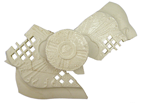 | 5c decoratie | malgevormd reliëfdecor. Stijl Regence. Vlechtwerk. C-vormige krullen en met de hand opengesneden ruitjes |
