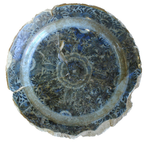 | 5c | bruin filet onder rand. Verder kobaltblauw. Vlag: zich herhalend floraal motief tussen filet aan rand en dubbel filet aan binnenzijde. Op de spiegel horror vacui floraal motief met daarrond dubbel filet blauw |