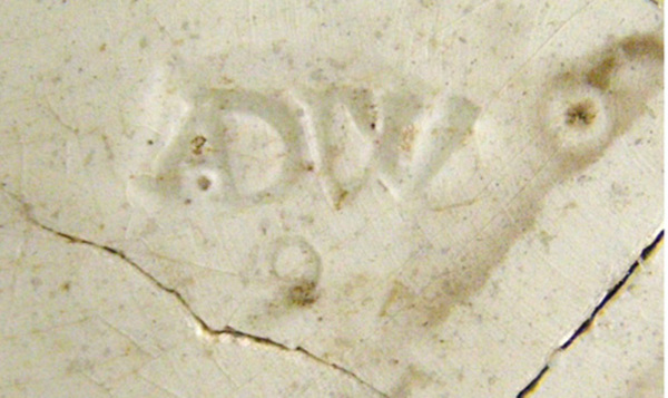 | 5d diversen | blindmerk: 'ADW'Ardennes, Namur, A.D. Vander Waert. Daaronder een onduidelijke maataanduiding. 1809 of later op basis van stempel. slijtage rand, snij-/krassporen op spiegel/binnenkant bodem |