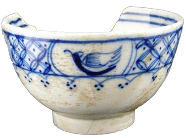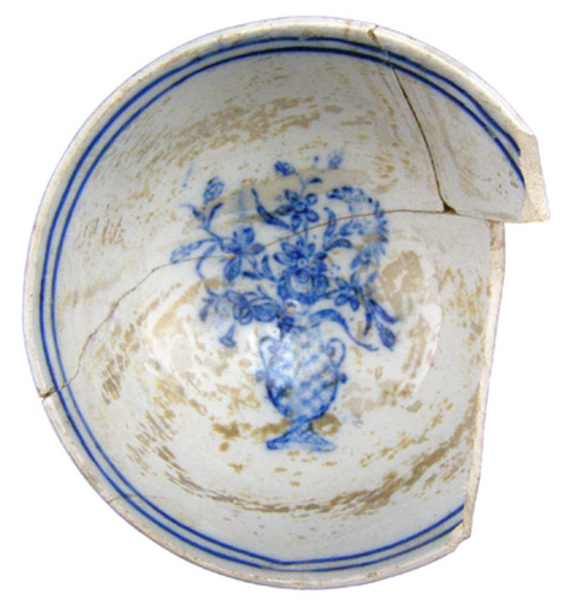 | 5c | uitw: onder rand geschilderde band van ruitvormig servetwerk met 4 cartouches waarin vogel. inw: op de bodem een vroeg drukdecor: vaas met bloemen blauw |