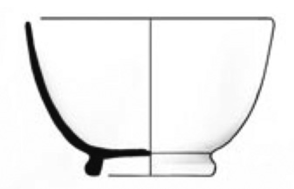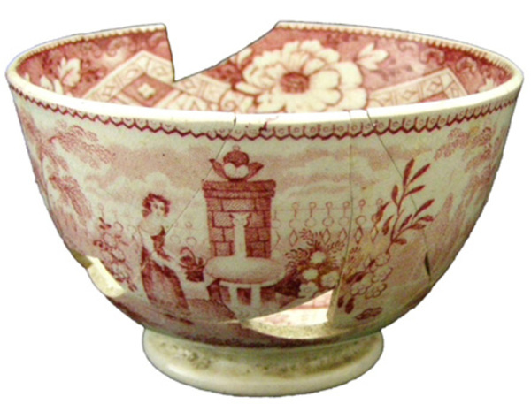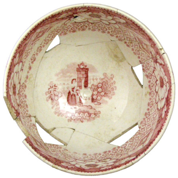 | 5d | Slordig aangebracht drukdecor met resulterende witte band. Centrale beschadiging op de spiegel van voor het glazuren. Tweede keus? |