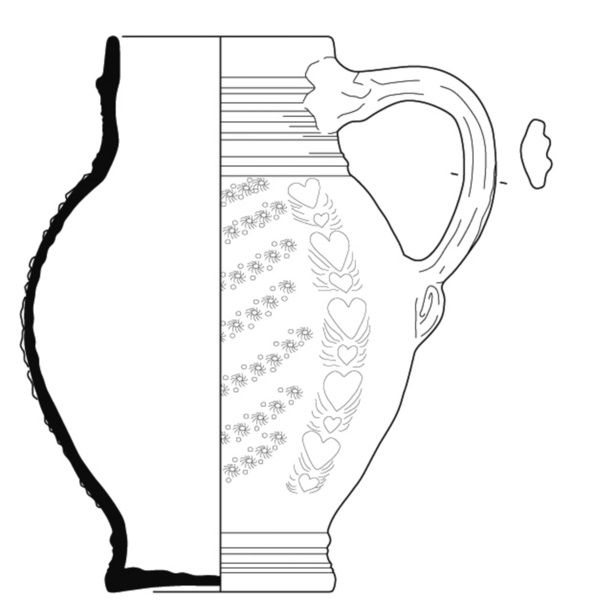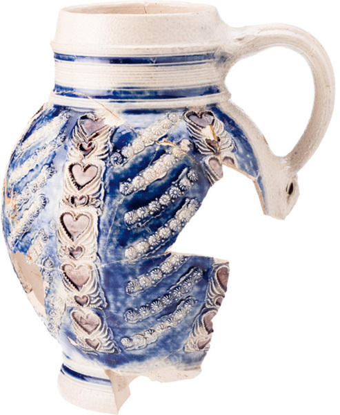 | 5c decoratie | appliques en snijwerk met kobalt- en mangaanoxide; verticale banen van harten, schuine banen van bloempjes, vlakdekkend blauw in spaartechniek blauw, paars |