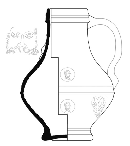 | 5c | caramelbruin oppervlak, baardman-applique, medaillons met kop, tekstband op buik: "......T.UND.ES" baardmankruik |