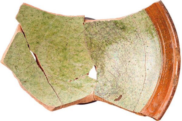 | 5c decoratie | inwendig vlakdekkende sliblaag tot knik spiegel-vlag met groen glazuur |
