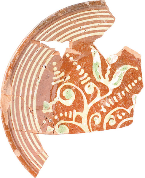 | 5c decoratie | ringeloor: sp: gestileerde bladeren met groene accenten vl: concentrische cirkels witte slib, groen |