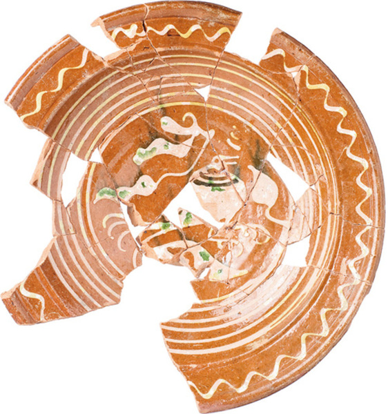 | 5c decoratie | ringeloor: sp: gestileerde bladeren met groene accenten, concentrische cirkels vl: slingerlijn witte slib, groen |