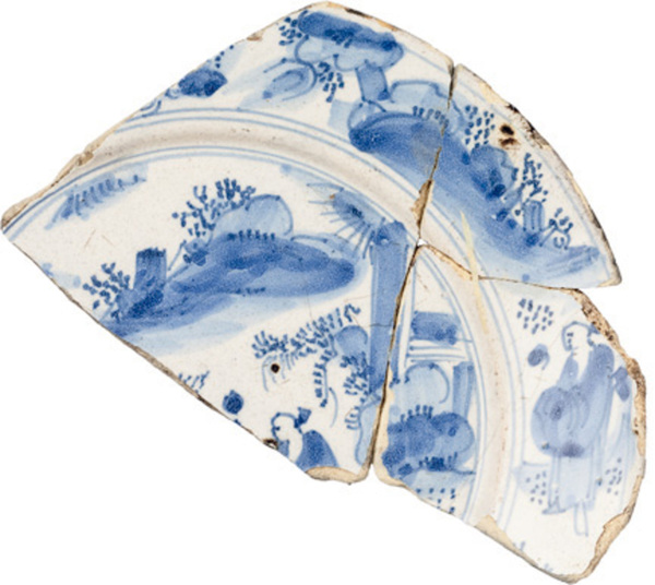 | 5c decoratie | sp: Chinees landschap met mensfiguren, concentrische cirkels, vl: Chinees landschap met mensfiguren blauwe beschildering |