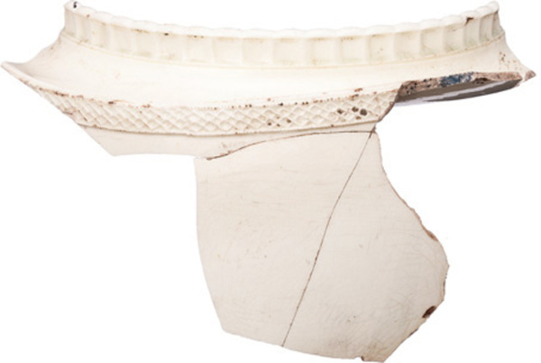 Dit is geen terrine, maar een creamware theeketel geweest, met een andere bodemvorm. Op de plaats van de "nokken" zaten ogen voor een hengsel. In hetzelfde rapport wordt een "ophangoog voor een wijwaterbakje" beschreven. Dit is één van die ogen voor het hengsel van de ketel. Ik heb een antieke parallel van black basaltware, exact dezelfde vorm. Ik kan evt een foto mailen. hartelijke groet, Wytze Stellingwerf Archeologie West-Friesland