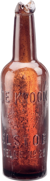 | 4b | slanke cilindrische bierfles met lange hals, afgeronde schouder, lip tonvormig verdikt met twee deukjes voor beugelsluiting, vormgeblazen, opgebolde bodem |