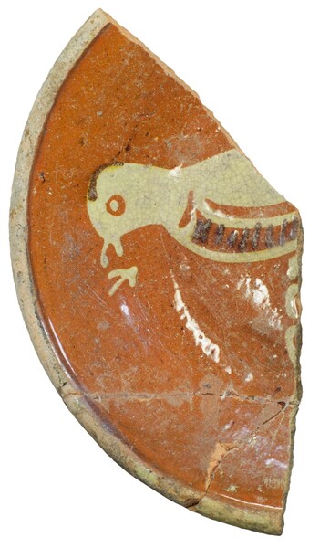 | 5c decoratie | slibversiering: geel/bruin vogel |