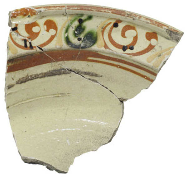 | 5c decoratie | slibversiering: bruin / groen / rood, o.a. boogjes, concentrische cirkels, krullen inwendig: polychroom |