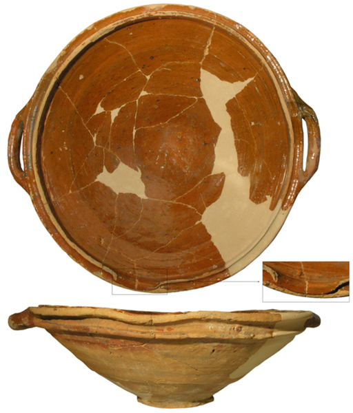 | 4b | grote, wijde kom (melkteil) met zware, aan bovenzijde afgeplatte kraagrand, standring |