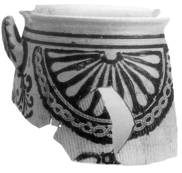 | 4b | hoge tonvormige pot met uitgebogen verdikte en aan de bovenzijde afgeplatte rand, ribbel onder randaanzet, standvlak |