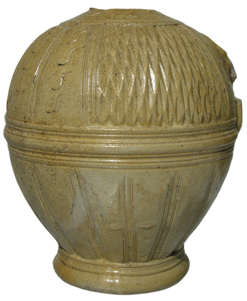 | 4b | rondbuikige kan met hoge nauwe hals met ribbels, met reliëfversiering, hoge standvoet |