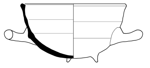 | 4b vorm | kom met scherpe knik bodem wand en rechte wand met een of meerdere ribbels, aan bovenzijde afgeplatte rand, lobvoeten |
