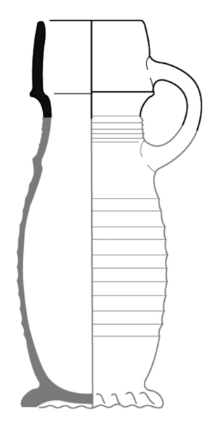 | 4b | hoge kan met licht gewelfde buik en ribbel op schouder, ingesnoerde hals met vrijwel cilindrische hoge kraag als mondrand, standring |
