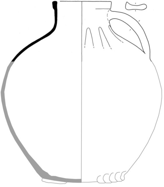 | 4b | bolle kan met hoge schouder en cilindrische hals met afgeplatte verdikte rand, lobvoeten |