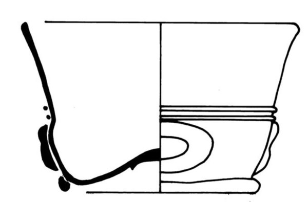 | 4b | conische beker met noppen op benedendeel, cuppa gescheiden door horizontale draad, opgestoken bodem met pontilmerk, voetring |