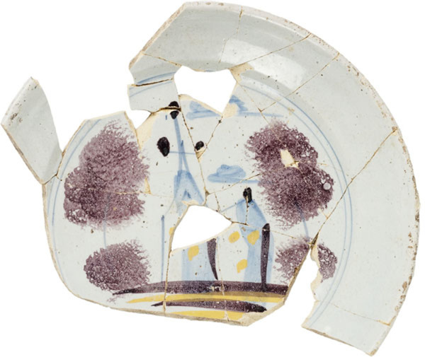 | 5c decoratie | paars, blauw, geel; spiegel: dubbele cirkel met kerk en bomen in sponswer polychroom |