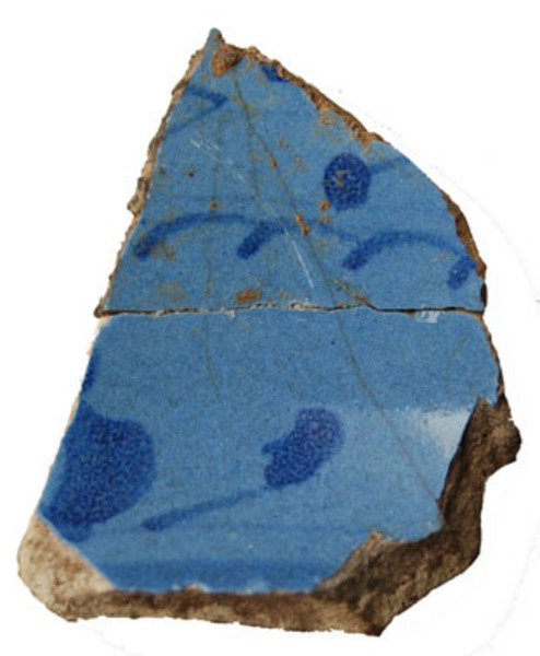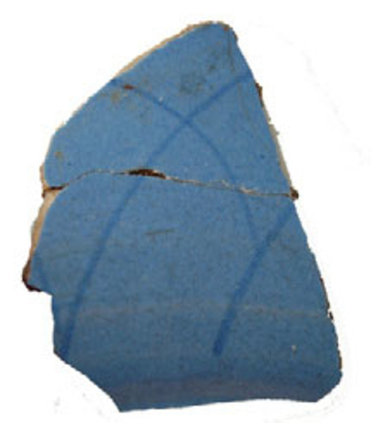 | 5c decoratie | lichtblauw glazuur met donkerblauwe beschildering (berrettino), op spiegel: ornamentaal decor, op onderzijde: elkaar kruisende bogen blauw |