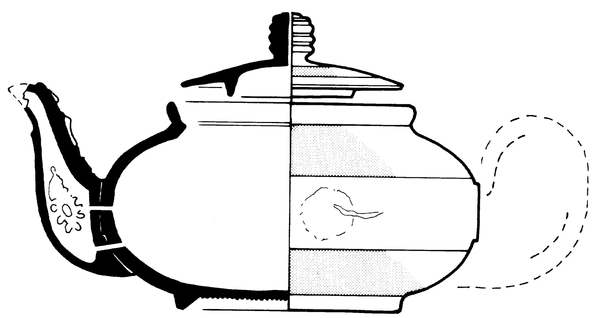| 4b vorm | lage bolle theepot met naar buiten geknikte rand met dekselgeul, standring |